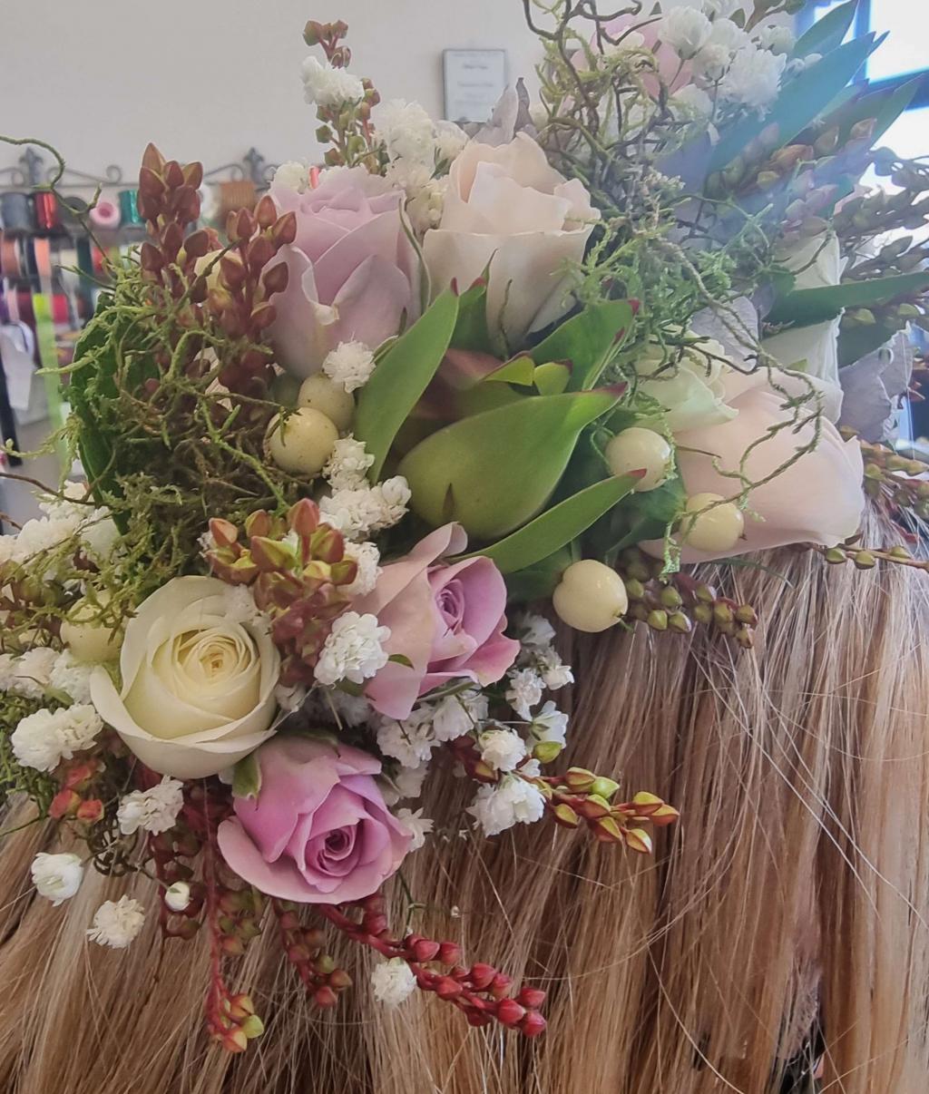 Hair flowers for bride maids and flower girls. Custom made with seasonal flowers in your colour scheme. Contact us for a quote.